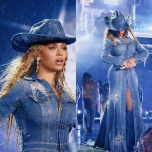 Beyoncé wearing custom Ralph Lauren belted denim gown and hat for the Cowboy Carter Tour in New Jersey. This ain’t Texas, but the…