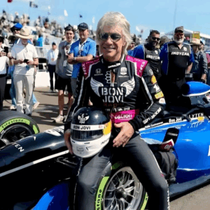 “Rock legend Jon Bon Jovi trades the stage for the speedway, posing in full racing gear at an IndyCar event with his name…